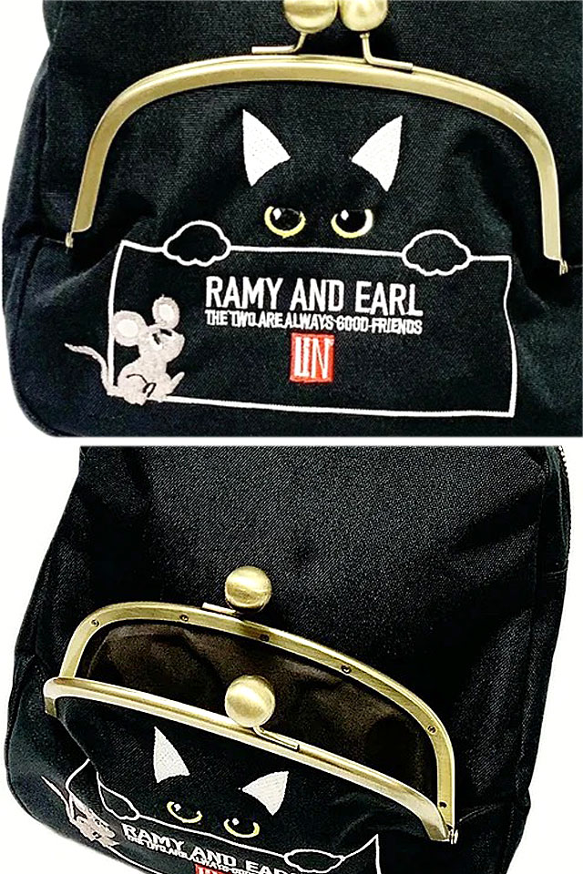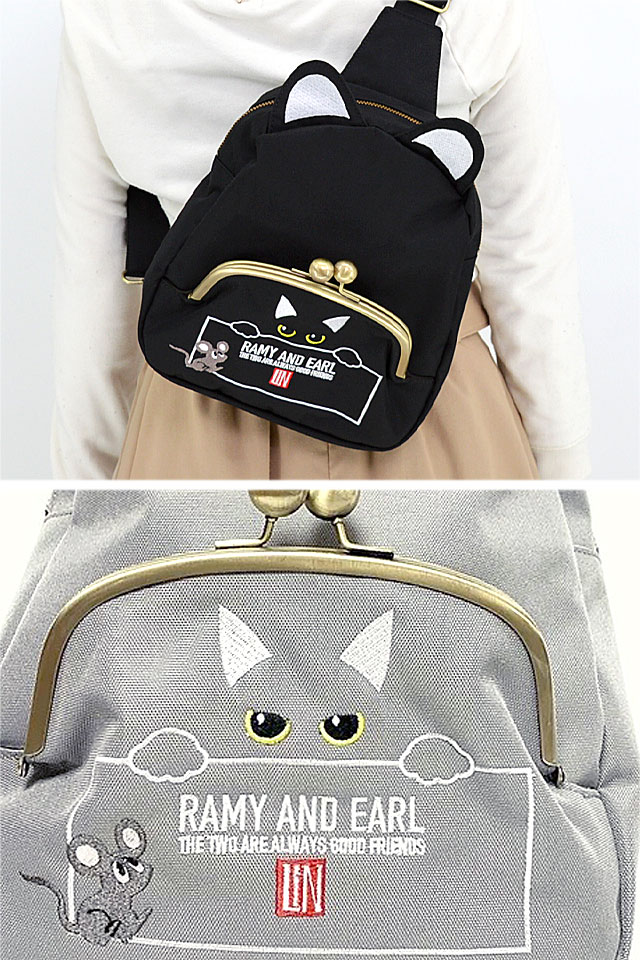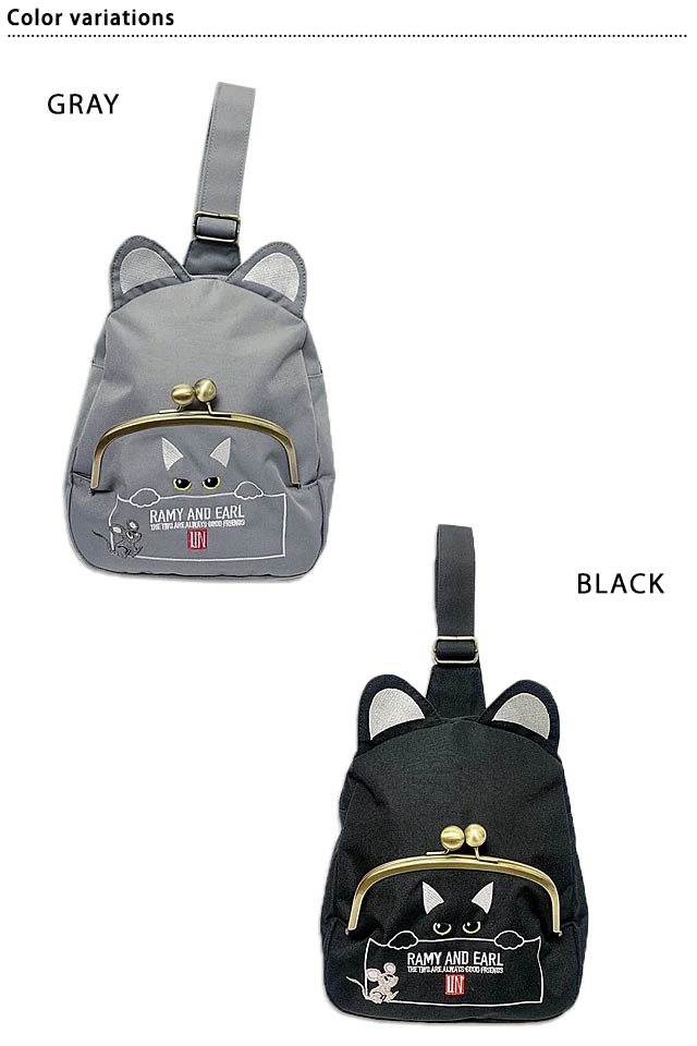 何でもあり、何でもやる新ブランド「LIN」から「猫耳ボディバッグ(AL-75710)」のご紹介です。 黒猫のLamy(ラミ)とネズミのEarl(アール)。 今回は猫耳のついたボディバッグが登場! バッグ上部をぐるりと走るジップがメインポケット。 |