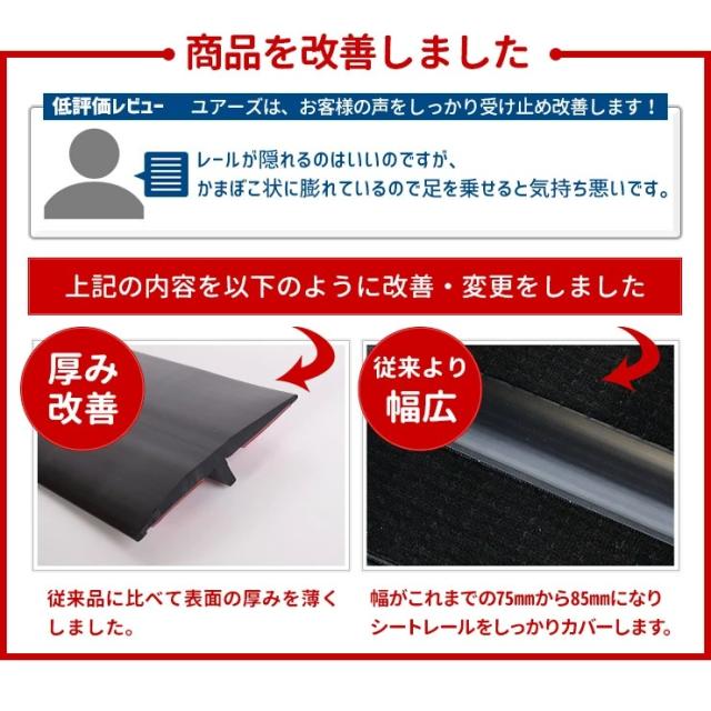- 必要な長さで切ってレールにはめるだけで 簡単にシートレールが守れます 薄く改良されてるのが良かったです 65cmと120cm1セットずつ購入しましたが 120cm1本が全体的に波打つように歪んでいまし...
