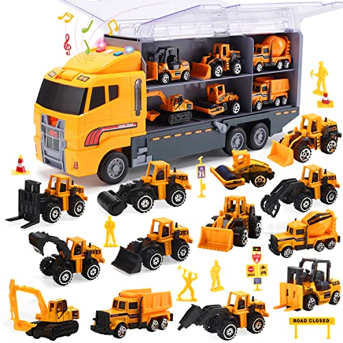 CUTE STONE 25 in 1 建設用トラック プッシュアンドゴー カーキャリア トラック おもちゃ 12個のミニダイキャストトラック付き