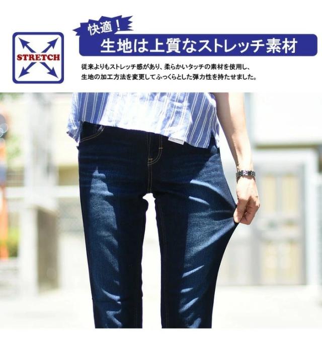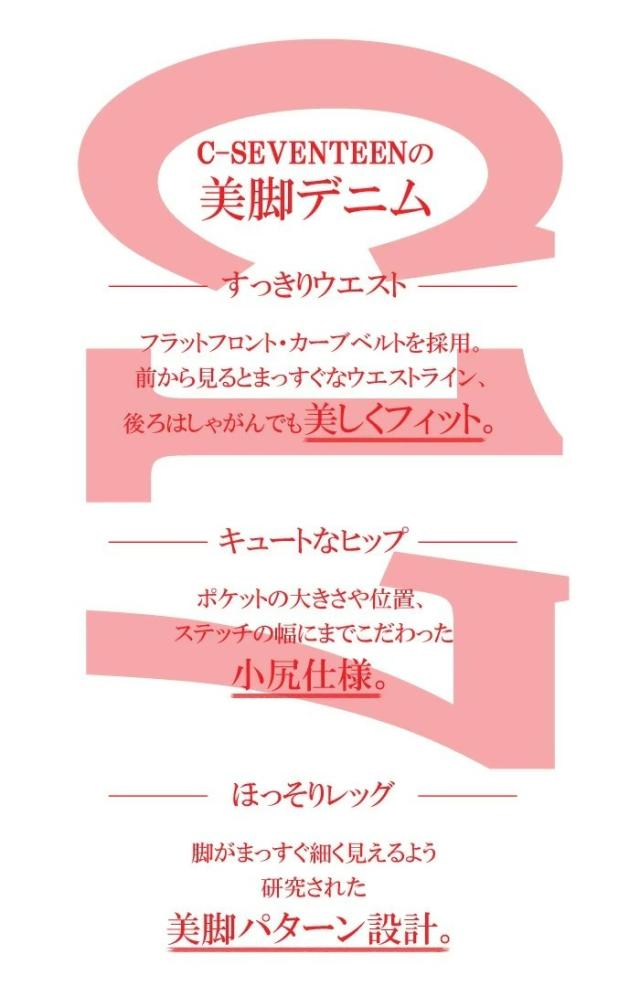 素材はお肌にもやさしく、ふっくらで柔らかな風合い、なめらかな肌触りのストレッチデニムを使用。お尻からふくらはぎまで美しくホールドする、こだわり抜いた美脚パターン設計。ポケットの位置や大きさ、ヨーク切り替えの高さなど、絶妙な黄金バランスを独自に研究した小尻仕様。