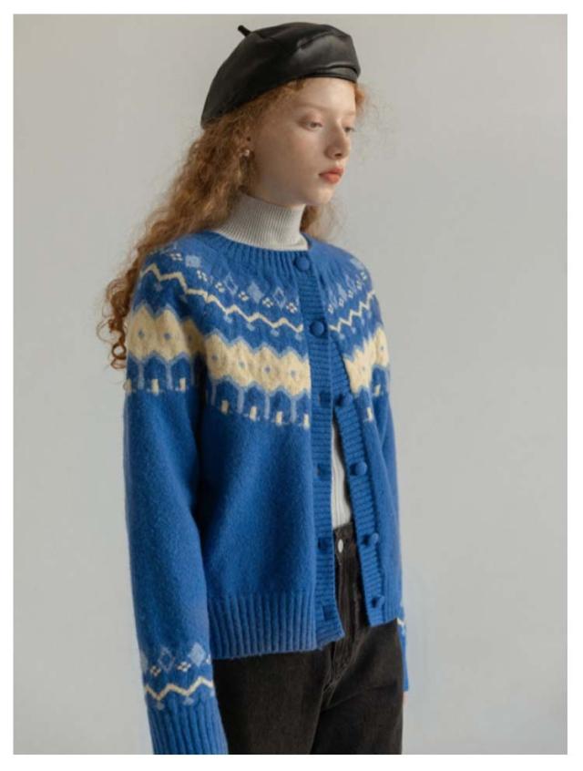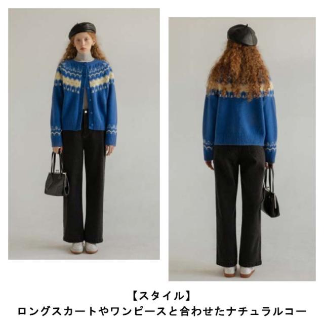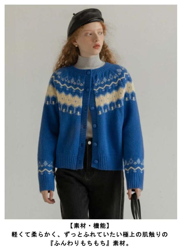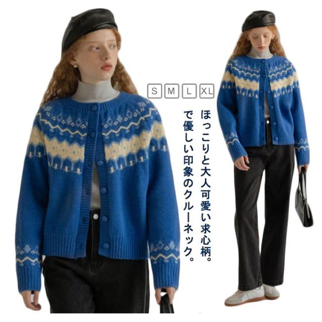 トップス ニットカーデ S-XL ノルディック柄 ショート丈 クルーネック カーディガン 秋冬 北欧 求心柄 防寒 丸首 レディース 暖かい 前開き 中厚手 幾何学 伸縮性 お洒落 可愛い エレガント きれいめ ゆったり