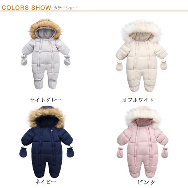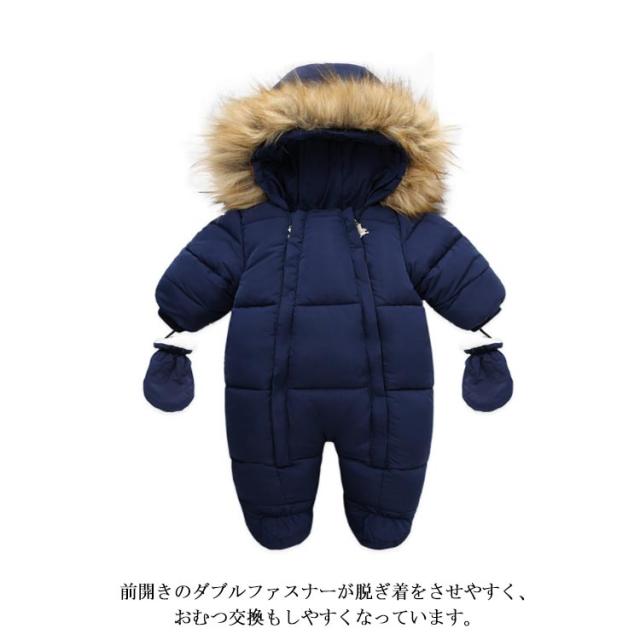 | 手袋付き!大人気!外へのお出かけに大活躍する赤ちゃんロンパースです。 中綿をたっぷり入り、裏地もフリースを使用しているので、暖かく肌触りもよい作りになっています。 前開きのダブルファスナーが脱ぎ着をさせやすく、おむつ交換もしやすくなっています。 袖口や裾口はゴム仕様で防寒もばっちり。 足や手もカバーできる手袋が付属しており、寒さ対策もばっちり。 スノーウェア、寒い日の通園、お出かけに適したアイテムです。 | |