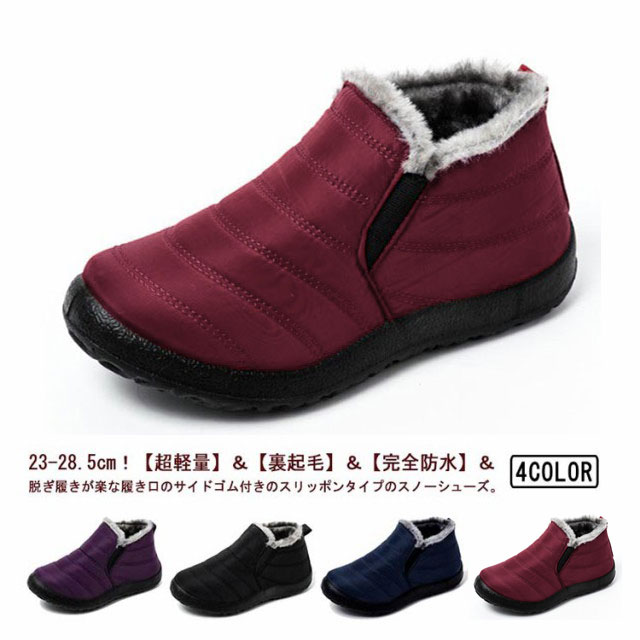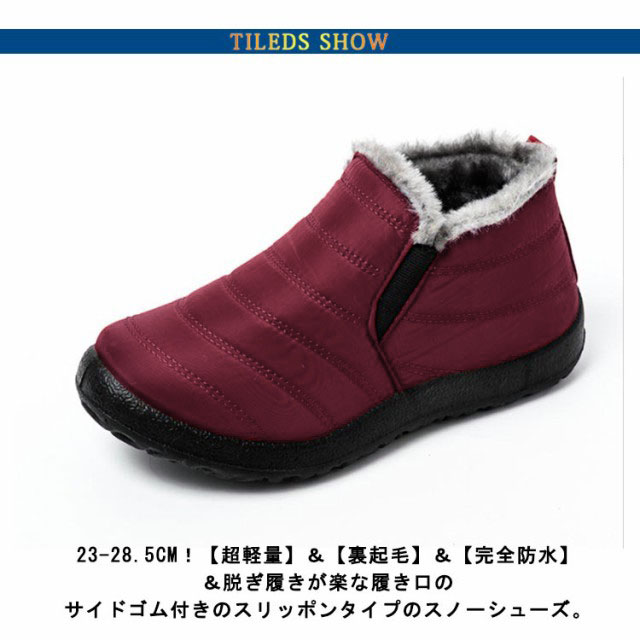 | 23-28.5cm!【超軽量】&【裏起毛】&【完全防水】&脱ぎ履きが楽な履き口のサイドゴム付きのスリッポンタイプのスノーシューズ。 脱ぎ履きが楽な履き口のサイドゴム付きで甲が高いの方もお履きいただけます。 肌触りのよい起毛素材の内張りで暖かく、寒い冬場も快適。 超軽量だから一日中履いても疲れにくく快適な履き心地。 アッパーに防水加工を施し、雨や雪の日でも水が染み込まず安心して履いていただけます。 落ち着いたカラーはどんなファッションも取り入れや すく男女問わずお薦めのデザインです。街履きもOKオシャレなスノーブーツなので寒い季節に重宝の一点です。 部屋履きからアウトドアシーンまで幅広く大活躍間違いなし! | |