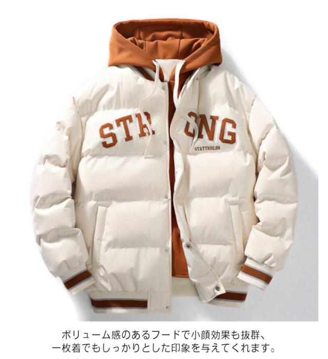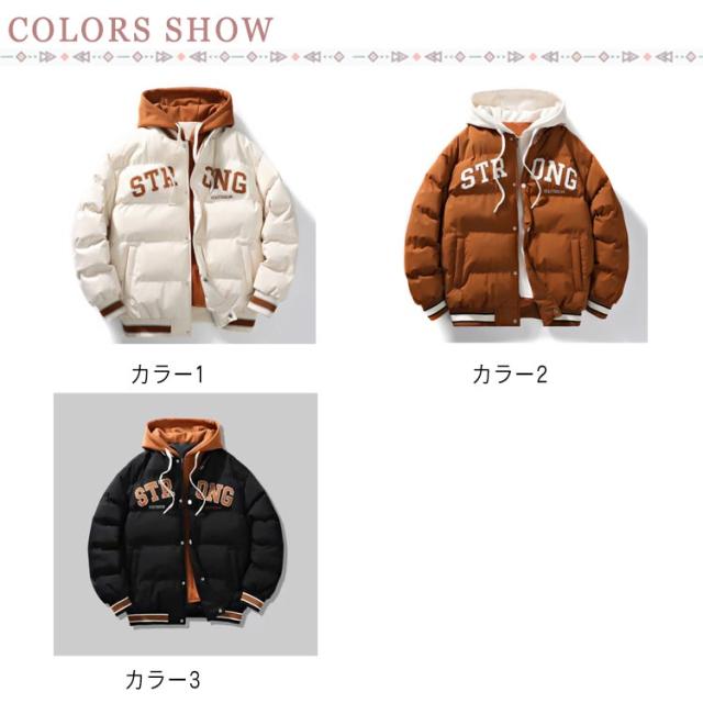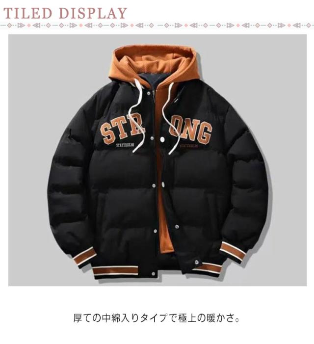 中綿ジャケット フェイクレイヤード 大きいサイズ 秋冬アウター スタジャン アメカジ M フード付き メンズ 3XL ゆったり おしゃれ 防風 ストリート系 ジャケット レディース L XL 2XL 中綿コート