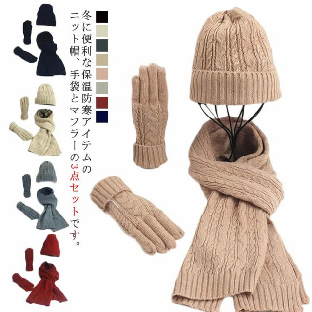 ニット帽 ネックウォーマー 通学 帽子 ニットキャップ 手袋 3点セット ケーブル編み レディース 防寒 暖かい 厚手 ニット帽子 ビーニー マフラー ゴルフ 大人 あったか 冬 無地 バイク 自転車 アウトドア スキー スノボ— ウインタースポーツ 登山 雪山 通勤 メンズ