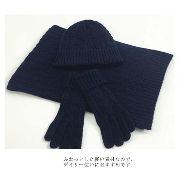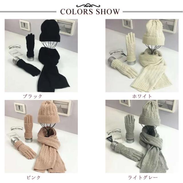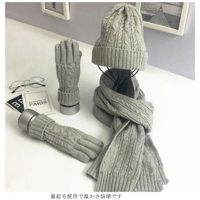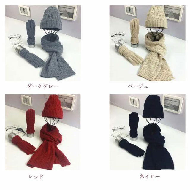 | 冬に便利な保温防寒アイテムのニット帽、手袋とマフラーの3点セットです。 ふわっとした軽い素材なので、デイリー使いにおすすめです。 頭、耳、首を完全に包んで、冬の通勤や通学の途中で、防寒性抜群、 風を防ぐことができます。 裏起毛使用で温かさ倍増です | |