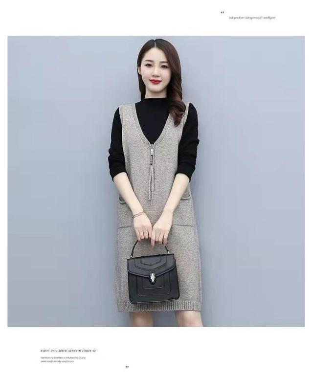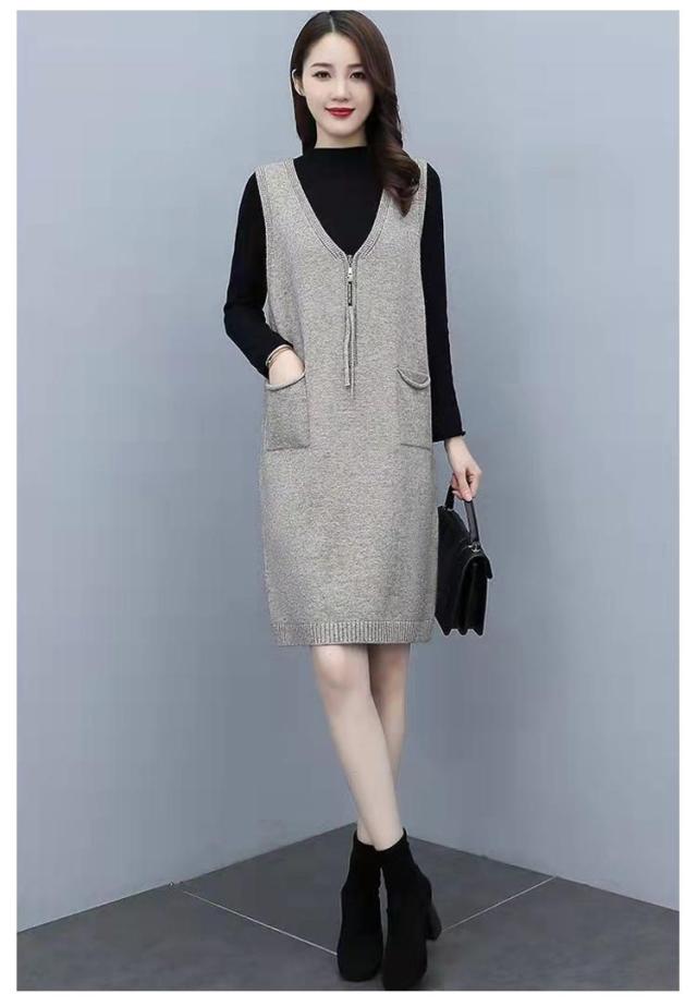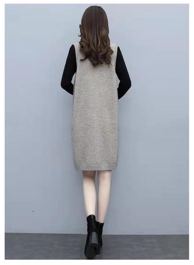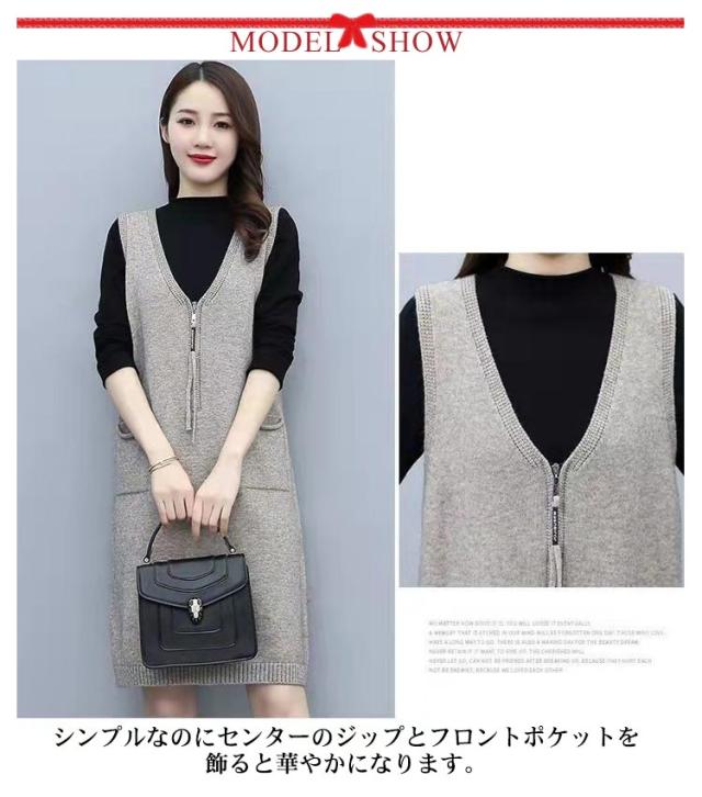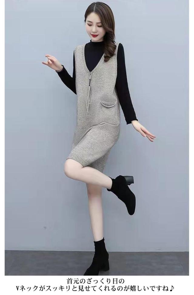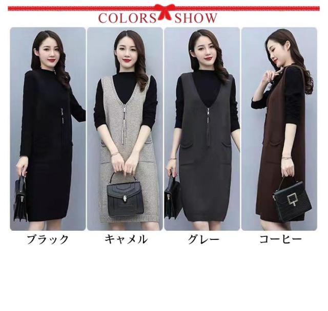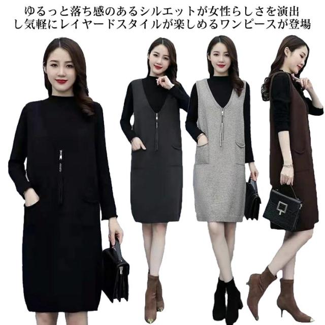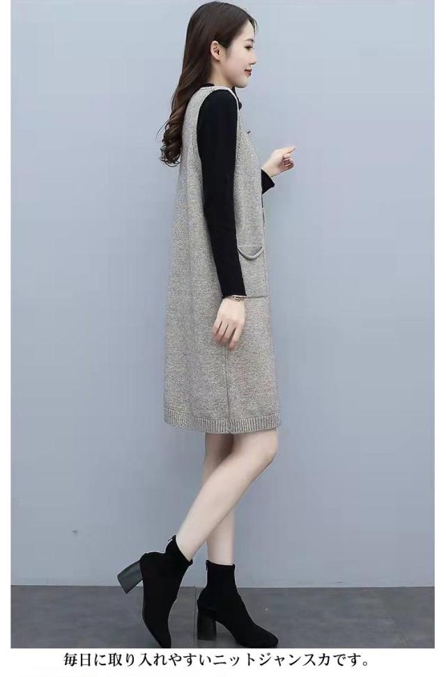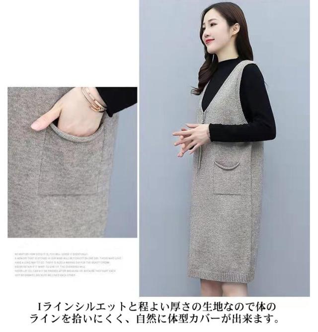 ニット ジャンパースカート ースリーブ レディース 重ね着 Vネック ひざ丈 ワンピース 秋冬 上品 大きいサイズ ロングベスト サロペット ジャンパースカート 体型カバー ワンピ かわいい 通勤 厚手 カジュアル ゆったり