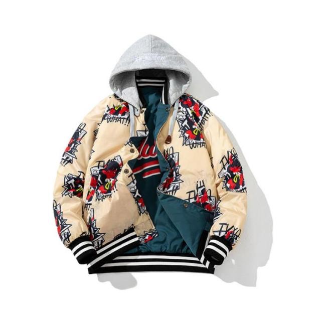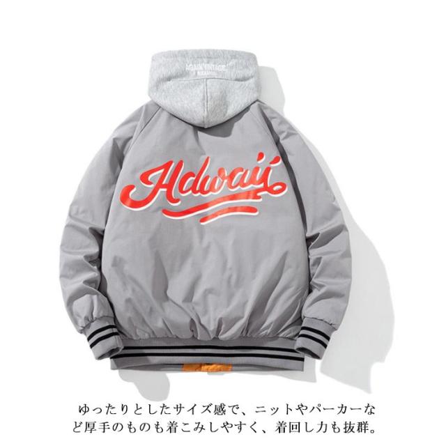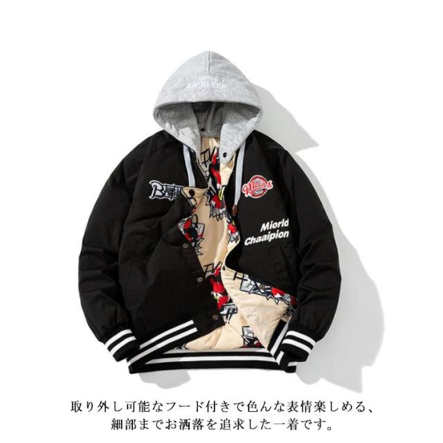 スナップボタン メンズ 大きいサイズ リバーシブル 冬用 スカジャン フード付き ジャケット 取り外し可能 ストリート 和柄 スタジャン ブルゾン b系 アウター ショート丈 メンズ フライトジャケット