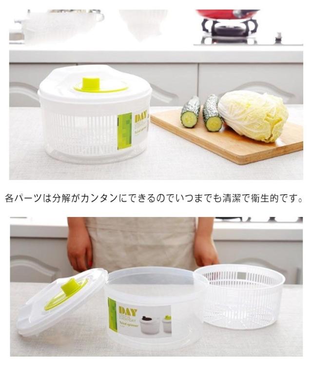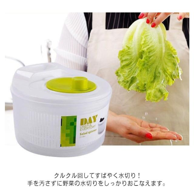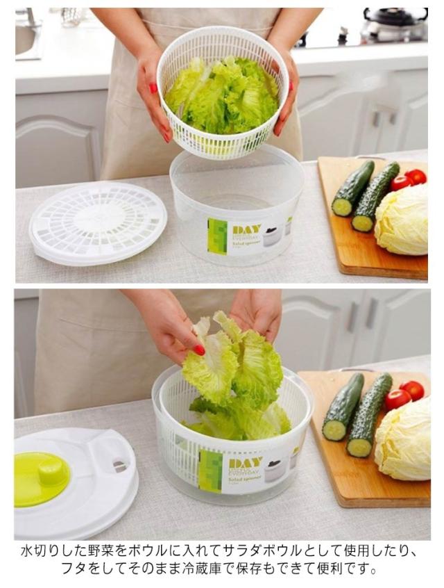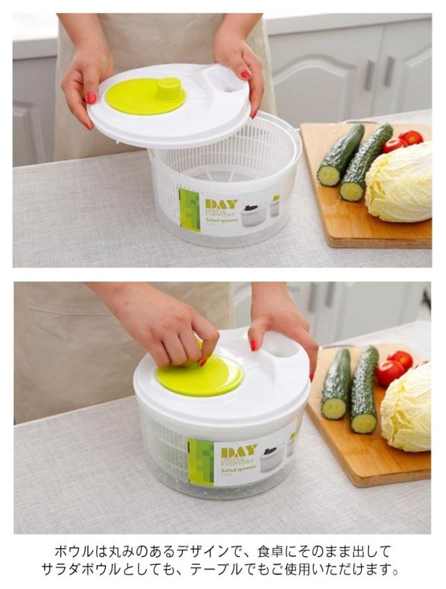 | 操作しやすい野菜水切り器 クルクル回してすばやく水切り!手を汚さずに野菜の水切りをしっかりおこなえます。 水切りした野菜をボウルに入れてサラダボウルとして使用したり、フタをしてそのまま冷蔵庫で保存もできて便利です。 ボウルは丸みのあるデザインで、食卓にそのまま出してサラダボウルとしても、テーブルでもご使用いただけます。 各パーツは分解がカンタンにできるのでいつまでも清潔で衛生的です。 | |