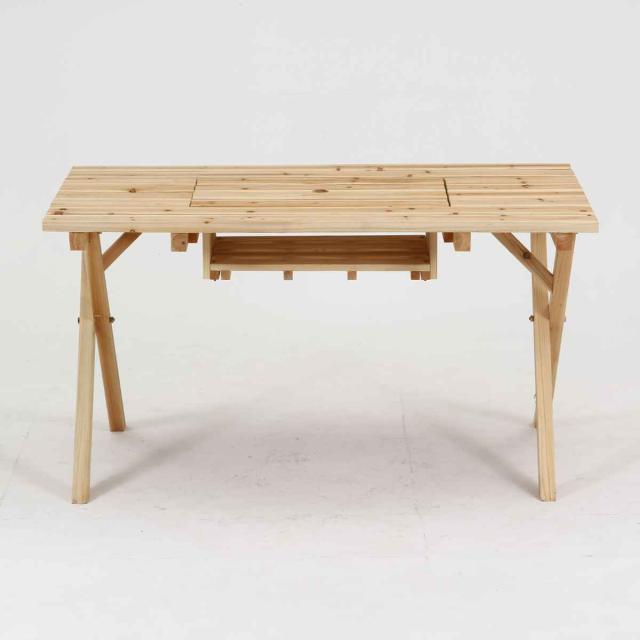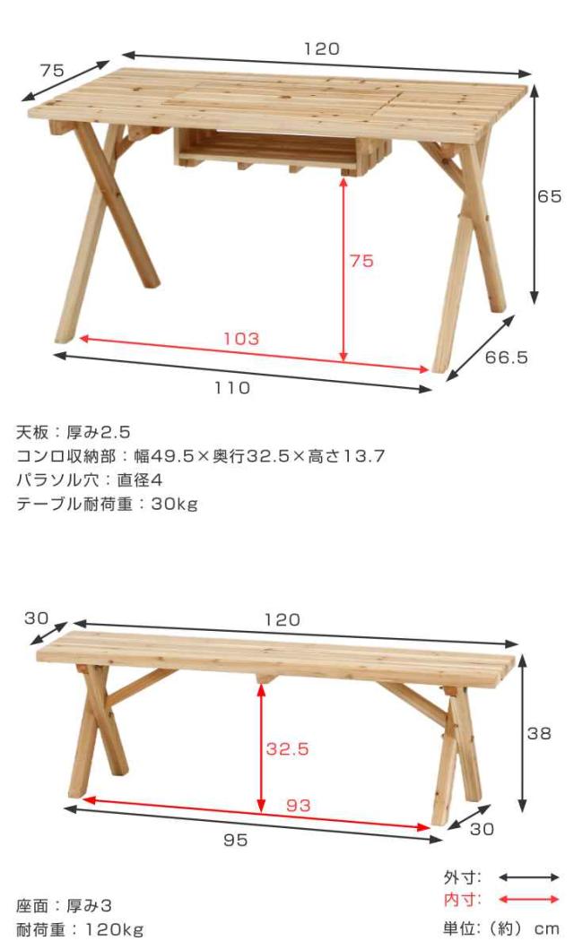 | サイズ | テーブル:約 幅120×奥行75×高さ65(cm) ベンチ:約 幅120×奥行30×高さ38(cm) 座面高:約 38(cm) コンロスペース収納部:幅49.5×奥行32.5×高さ13.7(cm) パラソル穴直径:約 4(cm) |