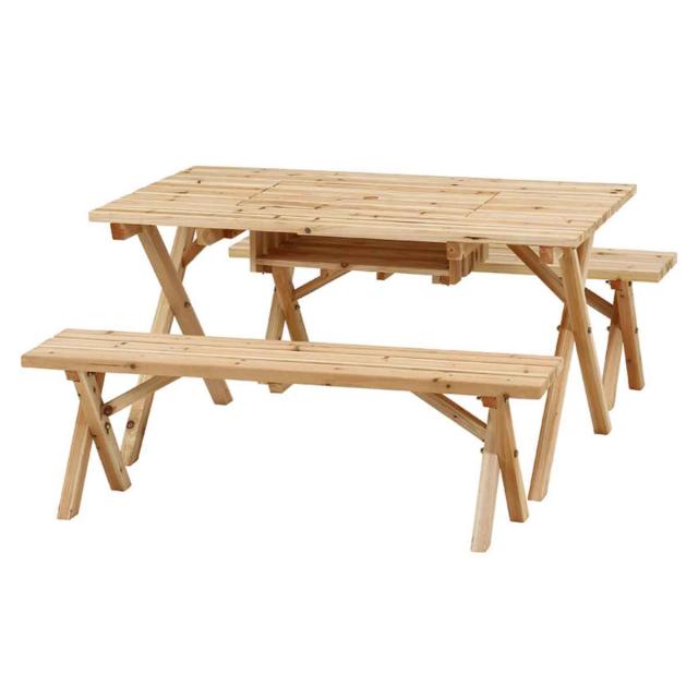 ガーデンテーブル BBQテーブル&ベンチセット コンロスペース付 木製 ( テーブル ガーデンチェア ガーデン 庭 木 机 ベンチ バーベキュー用 テーブルセット ウッドテーブル ウッドベンチ セット コンロラック 3点セット )