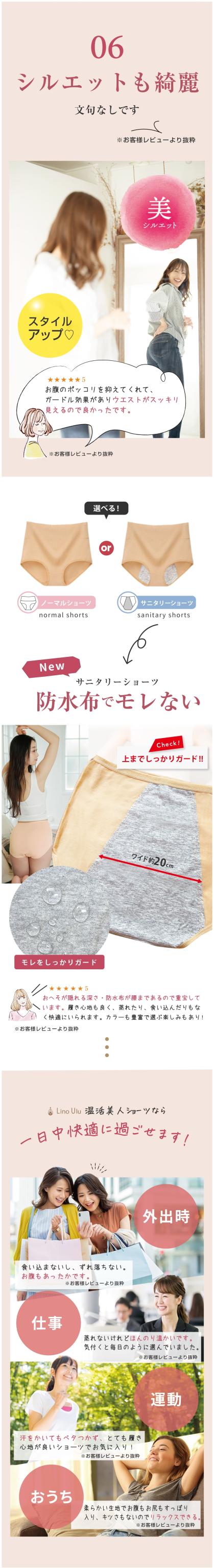 - はいウェストでお腹の締め付け感や足の太ももの付け根の締め付け感がないものを探していました。防水の部分も腰あたりまで長くついているので、安心して履けます。