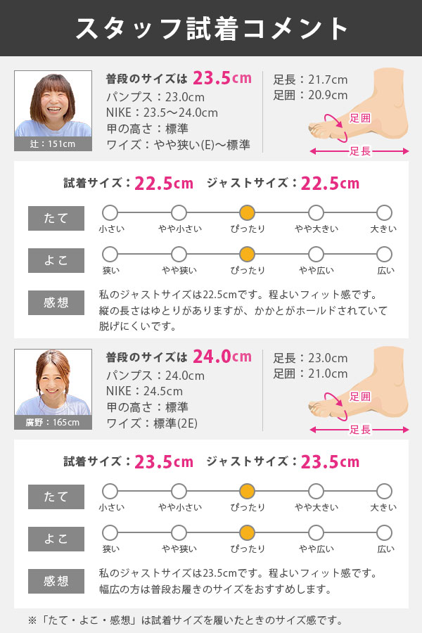 | 細身、普通の方→「0.5cm小さめ」 甲高、幅広の方→「標準サイズ」 こちらのアイテムの足入れは大きめです。 |