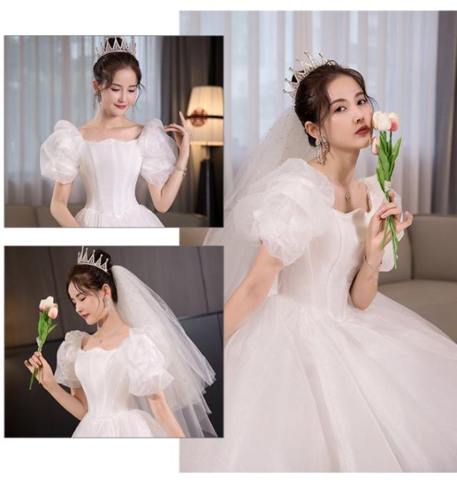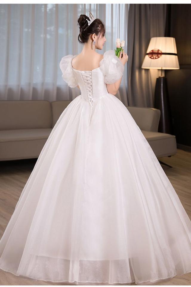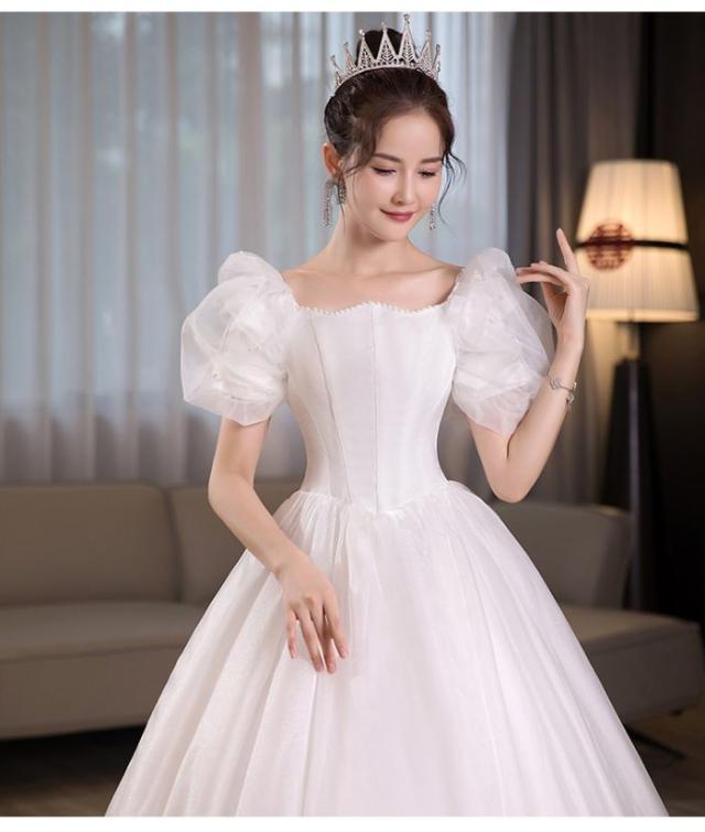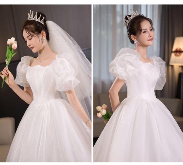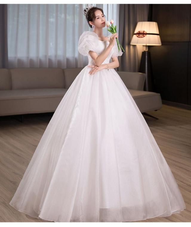 ウェディングドレス プリンセスライン ロングドレス プリンセスドレス ホワイト パフスリーブ お嫁さん 結婚式 編み上げ シンプル 無地 花嫁