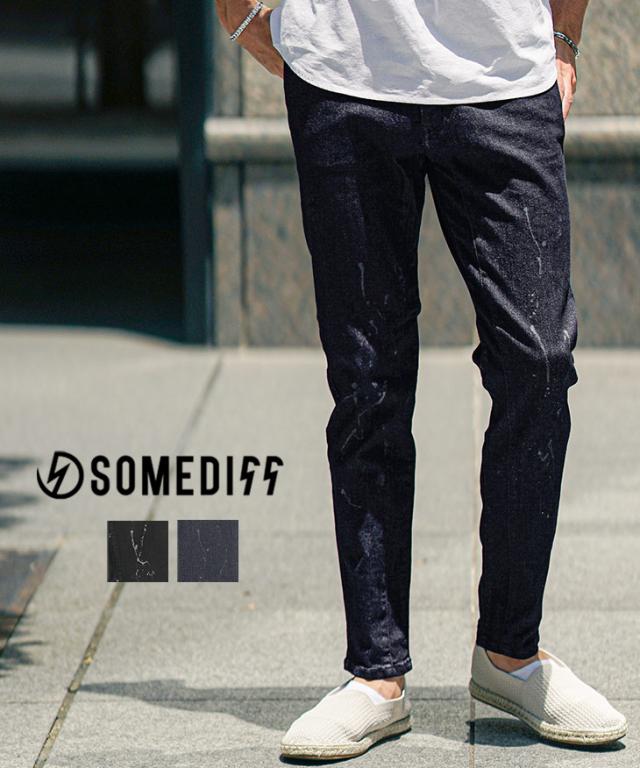 SOMEDIFF(サムディフ)『スプラッシュデニムパンツ』【スプラッシュデニムパンツ】■Design/デザインややゆとりを持たせたシルエットに仕上げ、オトナの悪さと余裕感を惹き立たせる1本。 デニム全体に散りばめられたスプラッシュのデザインがさりげない存在感を演出し、細部までの拘りを感じさせる。遊びを取り入れたパンツと共に、全力で遊び尽くす。■Material/素材感ストレッチの効いたデニム生地を採用し、窮屈感のない穿き心地を実現する。しなやかで脚のシルエットに馴染むため、穿けば穿くほど虜になる。
