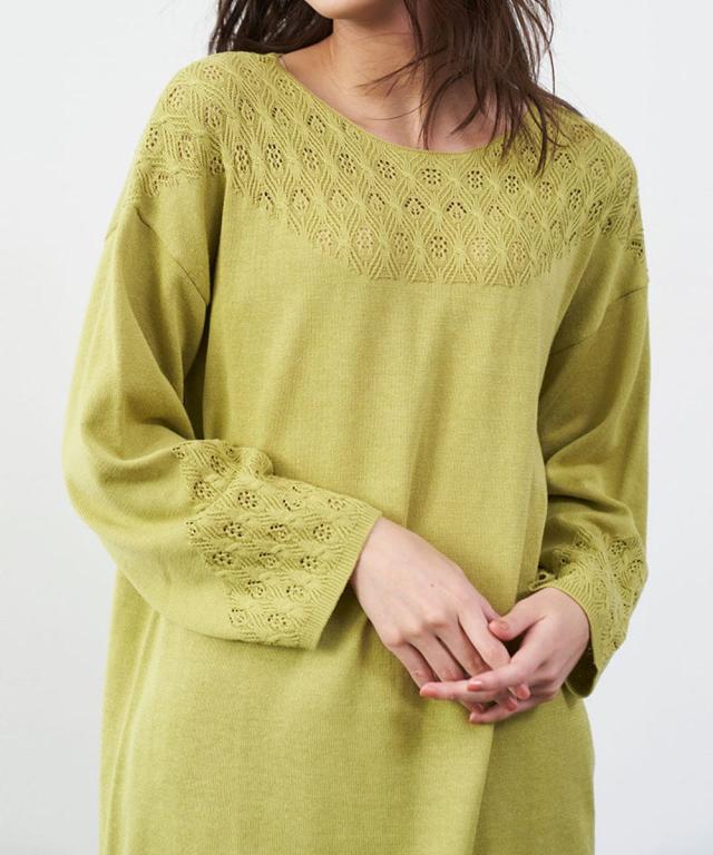 さりげない透かし編が上品で女らしいムードをプラス 袖部分と衿元に透かし編のディテールを取り入れたニットチュニック。長めの丈感とゆったりシルエットで、トレンドのシースルートップスやシャツをインしたレイヤードコーデにも活躍。 アクリル55% 綿45%