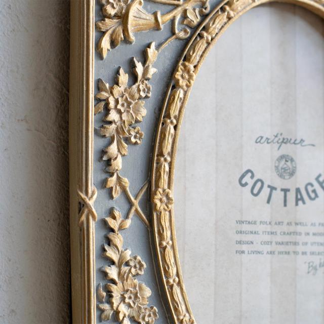 フレームに施された立体的な模様に、ゴールドの塗装が上品でお部屋に映えるデザインです。大切な写真はもちろん、お気に入りのポストカードやイラストなどを飾るのもおすすめです。