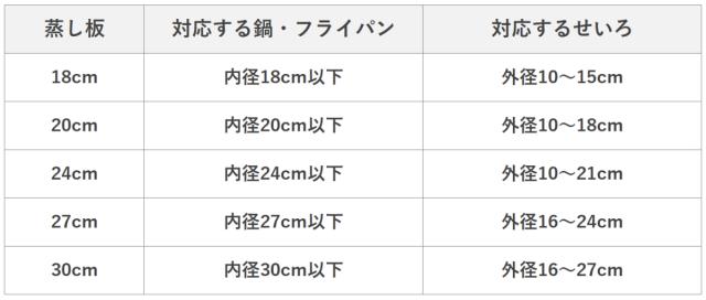 ※このページの蒸し板に適応する鍋サイズは内径24cm以下で、ご使用いただけるセイロのサイズ目安は10〜21cmです。