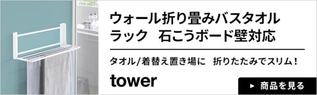 「tower 石こうボード壁対応 折り畳み棚」は、石膏ボードピンで壁面に設置できる折りたたみ式の棚。お風呂上がりにすぐ使いたいバスタオルや着替えの一時置き場が作れます。使わない時は畳んで、限られた空間でも省スペース。石膏ボードピンで壁面に設置できるので、浴室扉の近く、使いやすい高さに設置できます。タオルハンガーとしても使える、一台二役の便利なラックです。