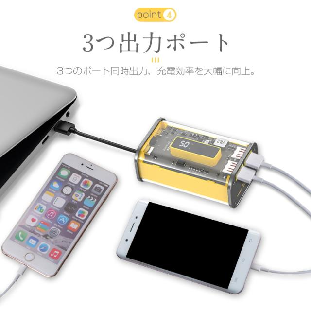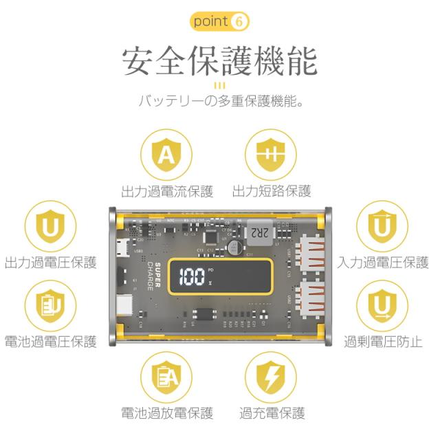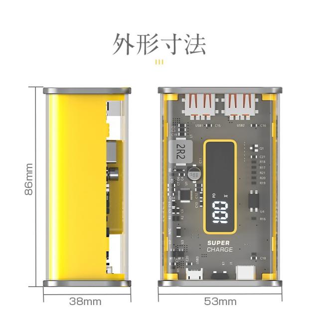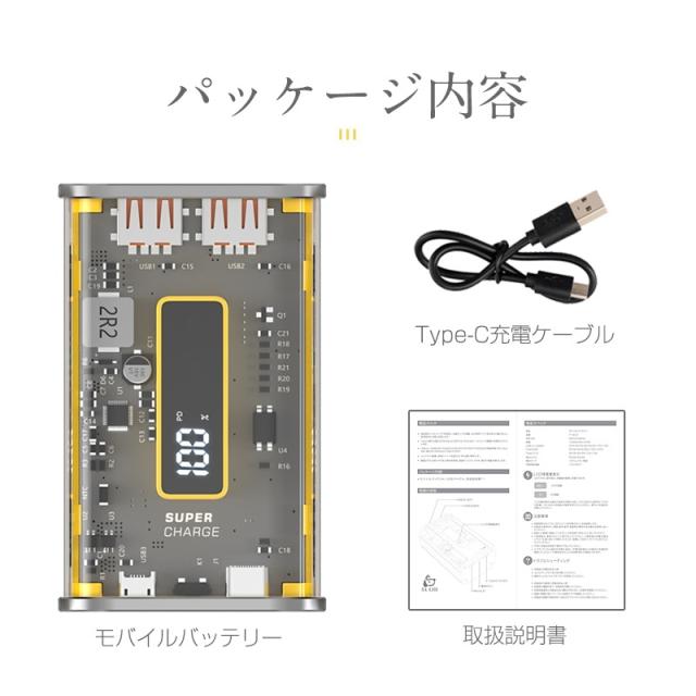 【近未来的なデザイン】常識を打ち破る透明ケースを採用され、圧倒的な近未来感をもたらす!最大の特徴はスケルトンで筐体の中のパーツやチップなどの内部機構が見えるデザイン。見ているだけでワクワクするモバイルバッテリーです。