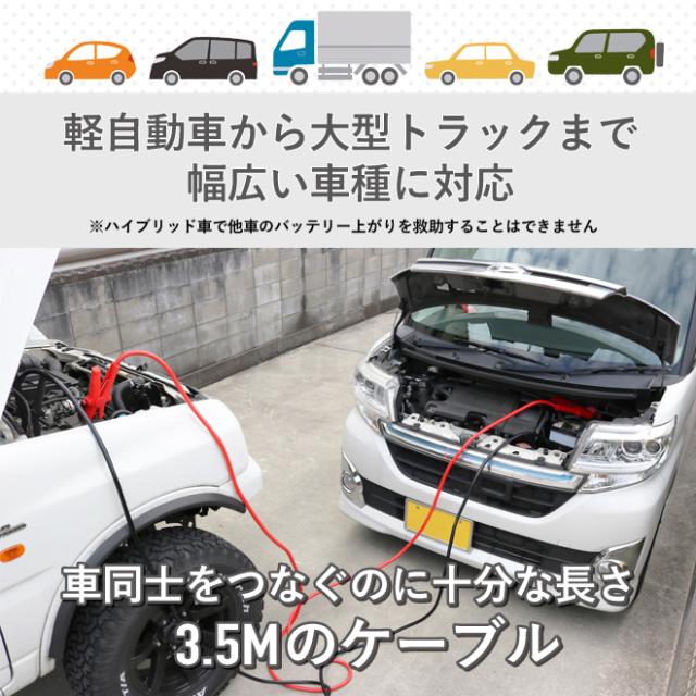※この商品は<アウトレット・未使用品>です ※収納袋に擦り汚れがございます ※返品・交換・キャンセルはお受け出来ませんのでご理解の上、ご購入下さい ・・・・・・・・・・・・・・・・・・・・・・・・ いざという時に備えて安心! ●バッテリー上がりの際に大活躍!ブースターケーブル 突然のバッテリー上がりでエンジンがかからない車も、ブースターケーブルがあれば 救護車から電流をもらいエンジンを始動できます ●軽自動車から大型トラックまで幅広い車種に対応 直径約11mm(25mm2)の太いケーブルで最大容量300Aまでの電流が安定的に 流れます ●クリップ先端まで絶縁カバーが付いているので、ショートや事故を防止します ●取っ手が付いた専用収納ケース付き 軽量なので手軽に持ち運びでき、トランクのちょっとしたスペースに収納できます ●工業製品国際規格GS/TUV/CEマーク全て取得の一級品です 【注意事項】 ・グリップの接続、取り外しの順番は必ず守ってください 間違った手順で行うとショートし、最悪な場合バッテリーの破裂の原因になります ・クリップ、クリップカバー、ケーブル等に破損、腐食がないか使用前に点検して ください ・赤の端子と黒の端子を両手で持って作業はしないでください ・ハイブリッド車で他車のバッテリー上がりを救援することはできません (ハイブリッド車が他のガソリン車から救援してもらうことは可能です) ★ブースターケーブル 4.5m(BOC-45N)はこちら 品番:BOC-36N |