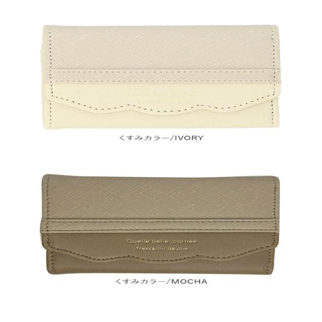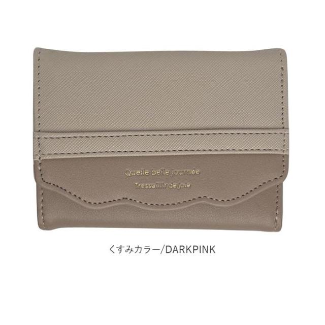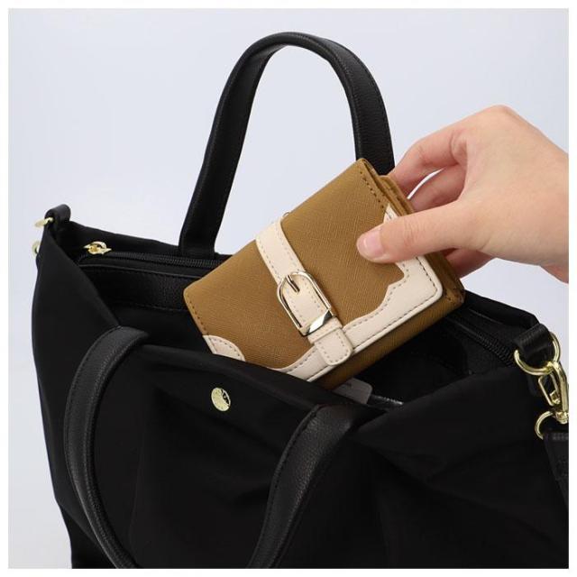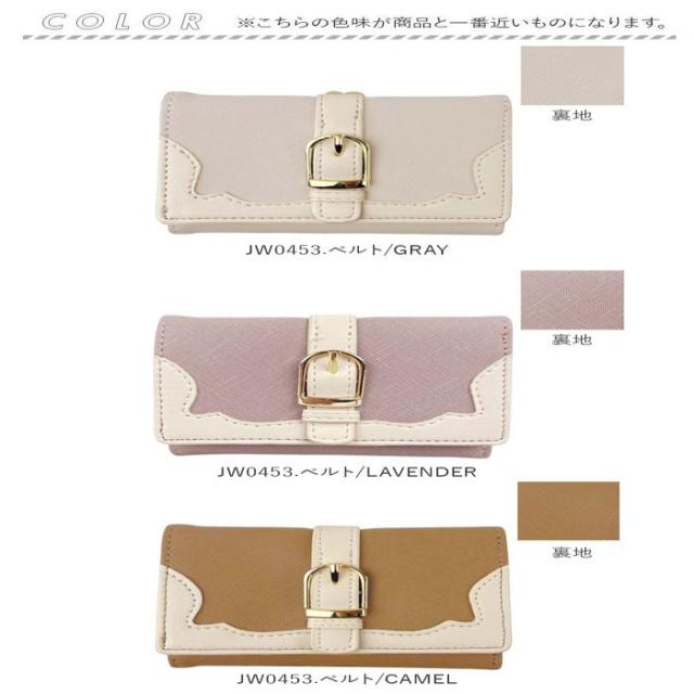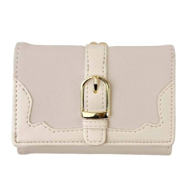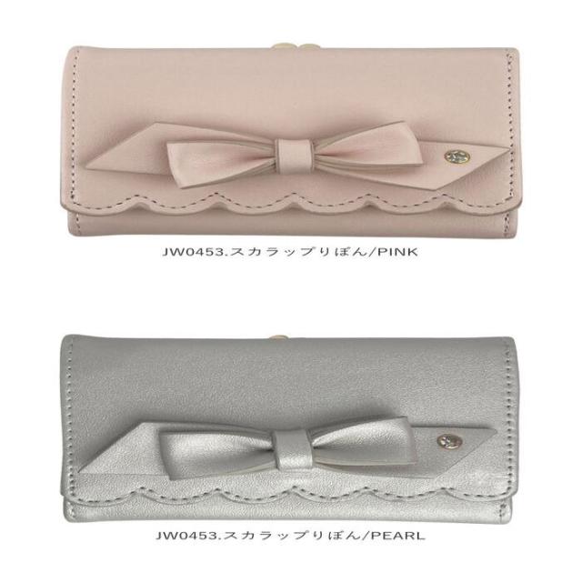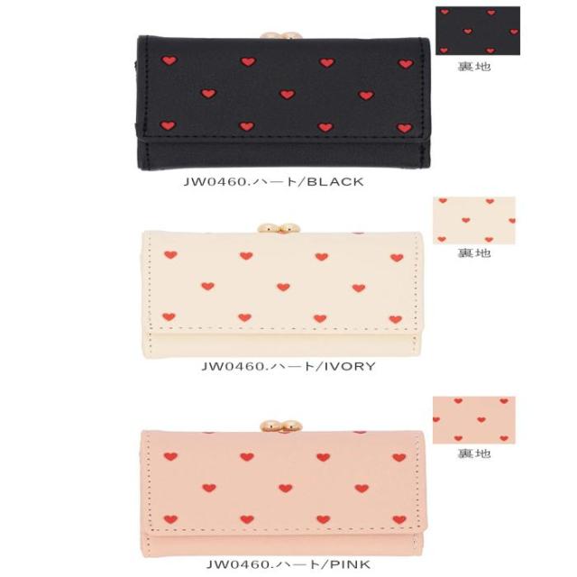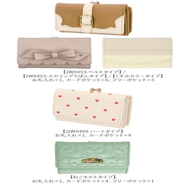 ミニバッグにもすっぽり収まるサイズ感♪大人かわいいがま口折財布が登場。表面にフェイクレザー素材を使用。ゴールドの金具使いで上品な雰囲気をプラス。(※デザインにより、質感が異なります。)お好みに合わせて選べるベルトタイプとハートタイプの2種類をラインナップ。がま口式の小銭入れを開くと大きく開くボックス型になっており、小銭の出し入れがラクチン。背面のオープンポケットには、サッと取り出したいICカードなどの収納に便利◎フラップ部分はスナップボタンでカンタン開閉。・【JW0453.ベルトタイプ】【JW0453.リボンタイプ】お札入れ×1、カードポケット×6、フリーポケット×3。・【JJW0460.ハートタイプ】お札入れ×1、カードポケット×4。中身が確認しやすく、現金派の方でもお会計がスピーディー◎