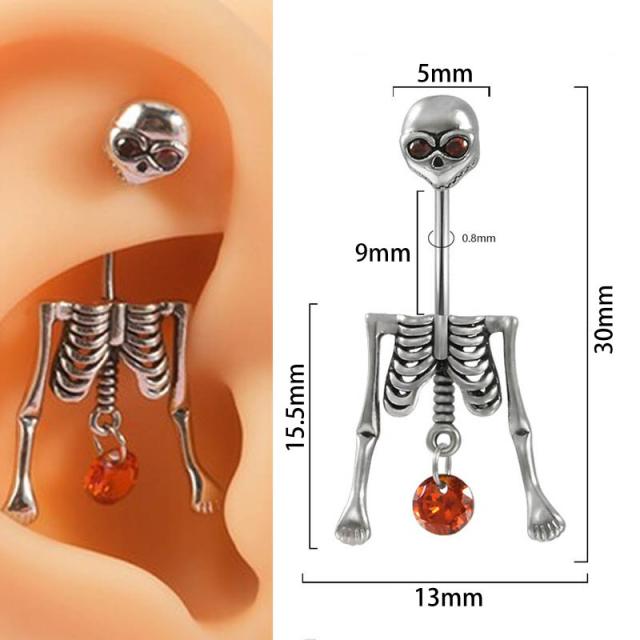 ドクロの目と肋骨の下に揺れるジュエルチャームが存在感を発揮してくれるボディーピアスは女性にも男性にも人気。ユニークなガイコのボディーピアス。シャフトがカーブしたバナナバーベル型タイプは軟骨ロック(ルーク)やダイスやコンクにオススメのボディピアスです。ゲージが細いので臍ピアス(へそピアス/ヘソピアス)には使いにくいかも。シャフトにネジ山のある外ネジタイプ(通常ネジ)のボディピアス。シャフトの素材は安心のサージカルステンレス316L製、デザイン部分は真鍮メッキのボディピアスです。メンズでもレディースでも使えるのでペアルックやプレゼントにも最適。友達や友人とおそろコーデも!