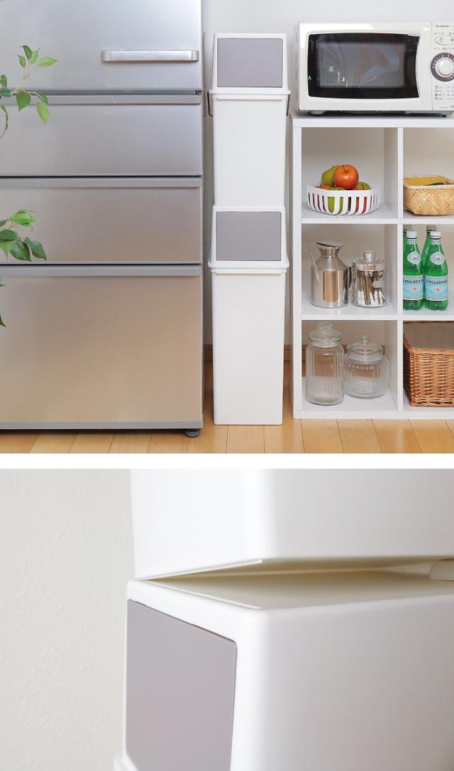 フロントオープンのふたなので、縦に積み重ねて使用することができるゴミ箱です。単体でのご使用はもちろん、17Lと25Lのサイズ違いを積み重ねて上下でゴミを分別することが可能です。わずか約幅24cmで幅を取らず、キッチンの隙間収納にもおすすめです。ふたの上部にはずれないように溝が付いており、しっかりと積み重ねることができます。