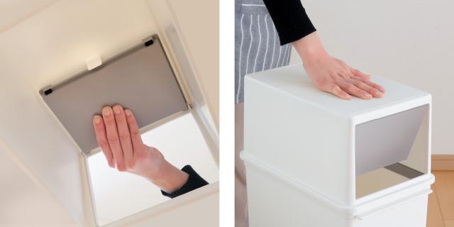 上部にふたを開けるスペースの確保が不要なので、棚下への設置もおすすめです。また、ペダルもなく前面もフラットになっている為、動線の邪魔になることもありません。