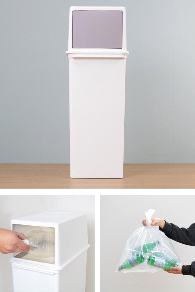 スリムで大きすぎないサイズ感なので使い勝手も良く、積み重ねて置けるのでスッキリします。500mlのペットボトルを潰さずに入れると約20本捨てることができます。