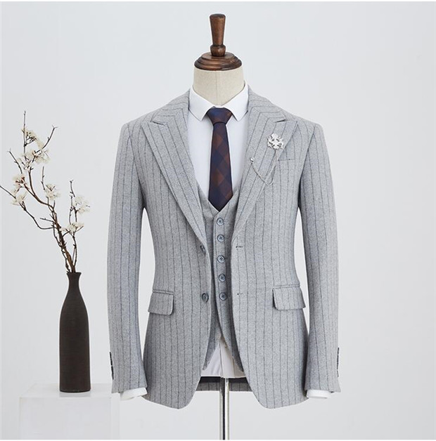 フォーマルスーツ メンズスーツ ウール ビジネススーツ 3点セット 縦縞スーツ 2ツボタン グレー 礼服 紳士服 メンズ ジャケット ベスト ズボン おしゃれスーツ 結婚式 二次会 メンズ ビジネス eg247c0c0la