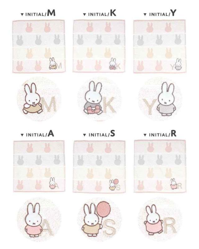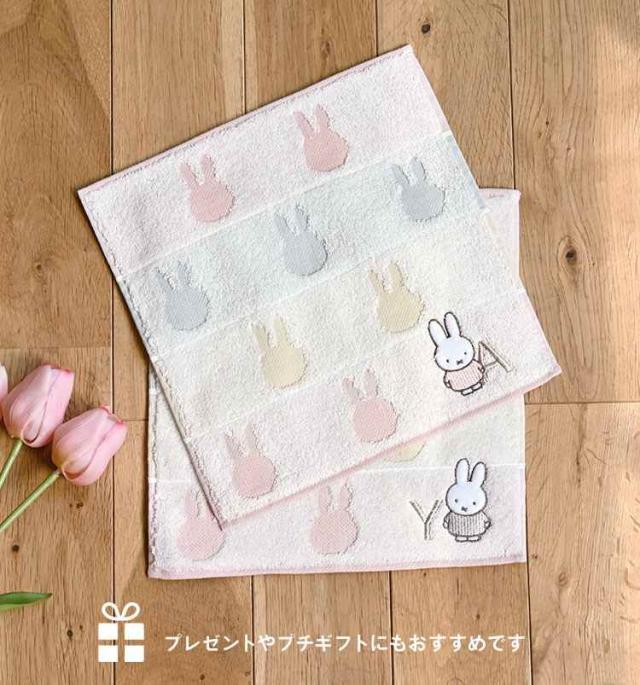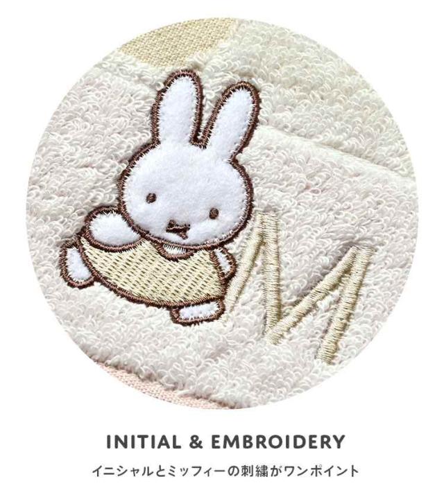 ミッフィーの刺繍がワンポイントのタオルハンカチ。やさしい色合いがかわいいです♪イニシャルごとに可愛らしいミッフィーがあしらわれています。吸水性の高いパイル生地で肌触りも気持ちいい◎プレゼントやプチギフトにもぴったりです。