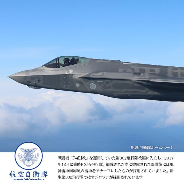 F-35と共に、仕様(英訳)と日本を象徴する「桜」の意匠を落とし込んだスペシャル感漂う仕上がり。F-35Aは、F-4戦闘機の後継として導入された最新鋭の主力戦闘機で、平成29年度から三沢基地に配備され第301飛行隊や第302飛行隊が運用しています。