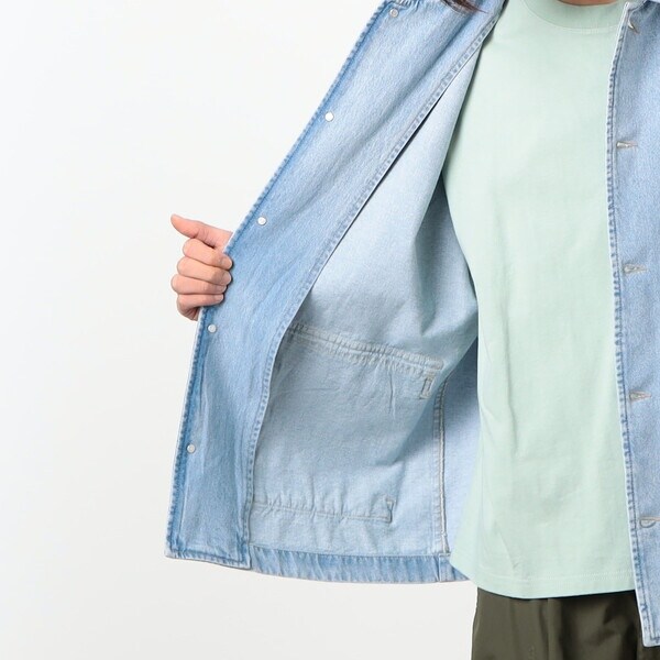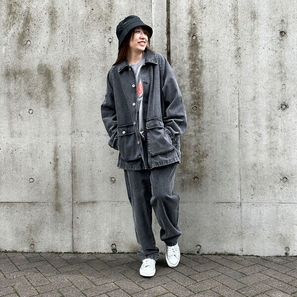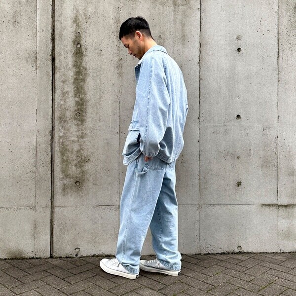 同じケミカルウォッシュデニムでつくるテーパードペインターパンツ(商品番号:55−01PC04−203)とセットアップで着ていただくのもおすすめです。