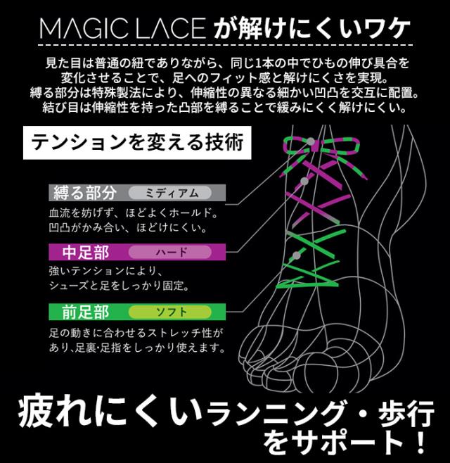 マジックレースは、見た目は普通の紐ながら同じ1本の中で紐の伸び具合を変化させることで、靴紐が「すぐ緩くなる」「解けやすい」といった問題を軽減させます。縛る部分は、特殊製法により伸縮性の異なる凹凸を交互に配置したことで縛った際に凹凸が上手く噛み合い、解けにくくなります。また中足部は伸縮率を低くし、シューズと足がしっかりフィットしてズレが生じにくくなります。前足部はストレッチ性があるため、足裏・足指をしっかり使えてストレスのない履き心地に。
