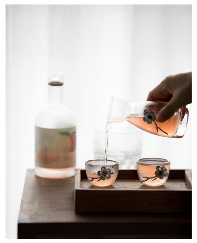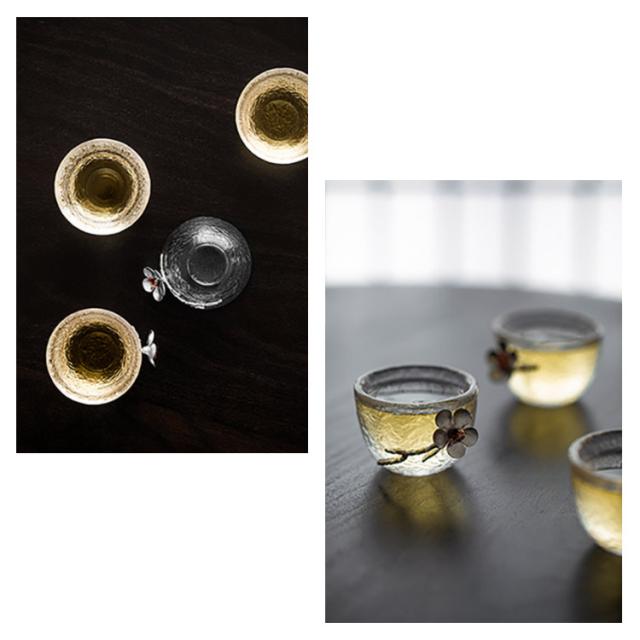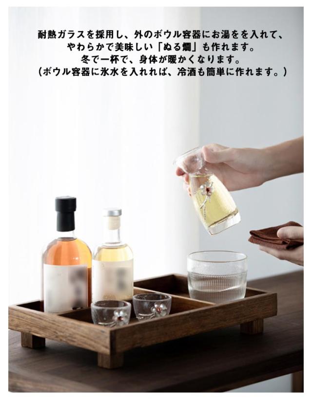 | 立体感のある梅の花をデザインしたおしゃれな徳利&おちょこセット。【セット内容:徳利*1、お猪口*2】 耐熱ガラスを採用し、外のボウル容器にお湯をを入れて、やわらかで美味しい「ぬる燗」も作れます。冬で一杯で、身体が暖かくなります。(ボウル容器に氷水を入れれば、冷酒も簡単に作れます。) 波を表現したかのような凹凸は、よせてはかえす波のようです。 普通の酒器よりやや厚みがあるので、丈夫で、割れにくく普段使いようにピッタリです。 ガラスの透明感とハンドメイドならではの味わいのある手触りで、より一層お酒を楽しむことができます。 | |