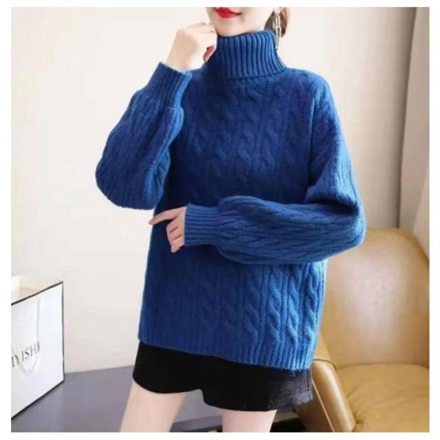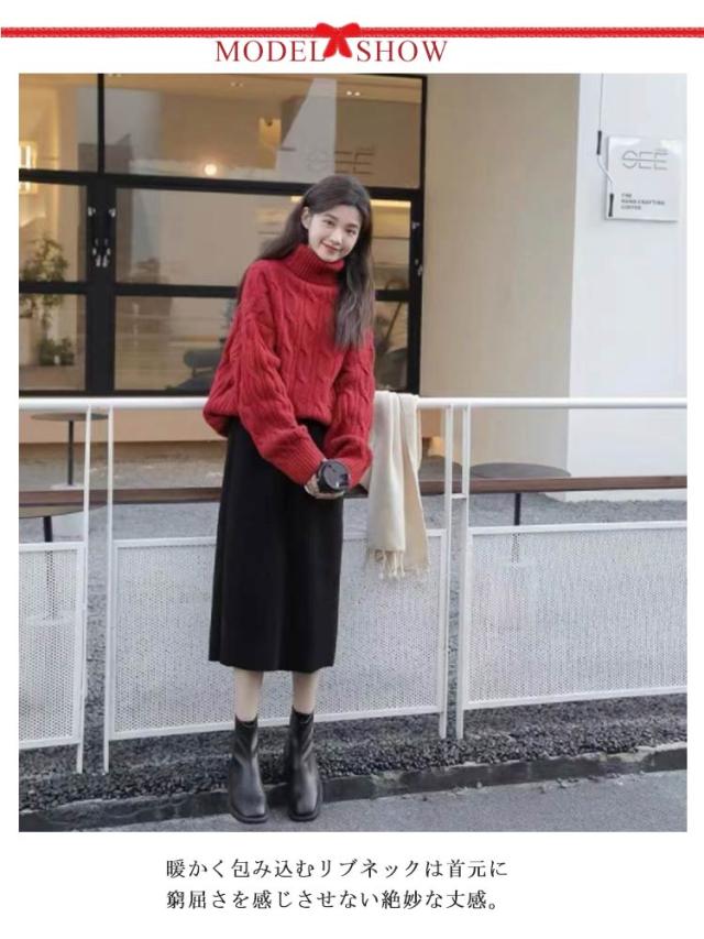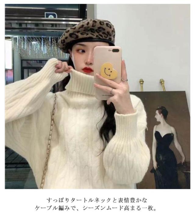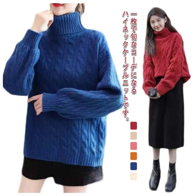 ケーブルニット セーター ハイネック タートルネック 体型カバー 秋服 プルオーバー 長袖 長そで 畦編み ぽわん袖 タートルニット ざっくり 肉厚 バルーン袖 ゆったり トップス ニット