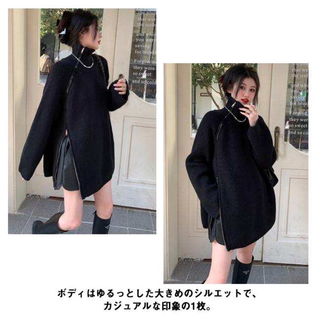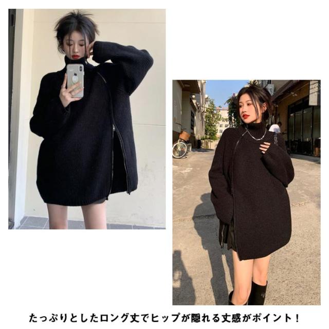 | サイドダブルジップ付きのトレンド性のあるニットセーターです。 たっぷりとしたロング丈でヒップが隠れる丈感がポイント! ボディはゆるっとした大きめのシルエットで、カジュアルな印象の1枚。 首元までしっかりとあたためてくれるタートルネックニットは、寒い季節に重宝まちがいなしのアイテムです! 身体をやさしく包み込む、ふわふわ軽い着心地が魅力です☆ | |