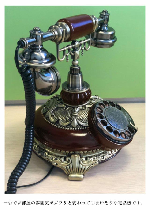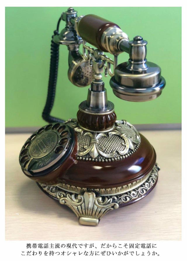 | ☆昔懐かしい黒電話風のオシャレなインテリア電話機です。 ☆インテリアとしてお店などの装飾にもオススメです。 ☆携帯電話主流の現代ですが、だからこそ固定電話にこだわりを持つオシャレな方にぜひいかがでしょうか。 ☆一台でお部屋の雰囲気がガラリと変わってしまいそうな電話機です。 | |
