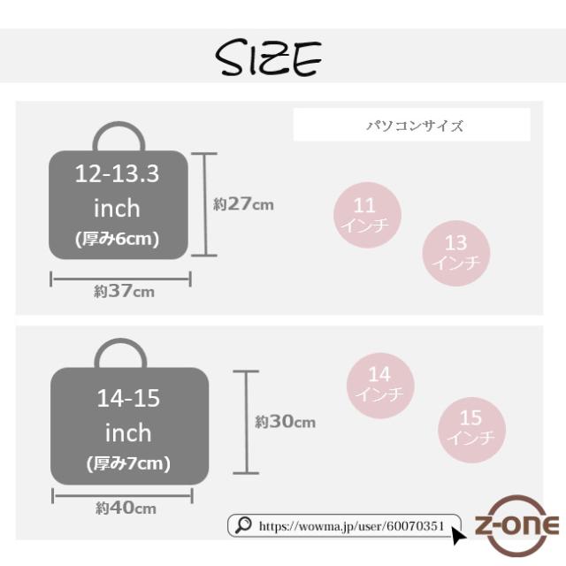 ■サイズ内寸12-13.3インチ:縦約27cm×横37cm×幅約6cm14-15インチ:縦約30cm×横40cm×幅約7cm15.6インチ:縦約33cm×横44cm×幅約8cm17.3インチ:縦約36cm×横47cm×幅約9cm(在庫なし)※手作業による測定の為、サイズにつきましては1〜3cmの誤差が生じる場合がございます。こちらの商品は汎用品となっており、お手元のパソコンによっては必ずピッタリと入ることがない場合がございます。
