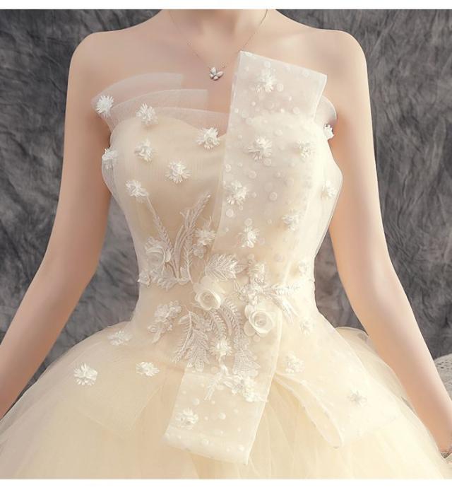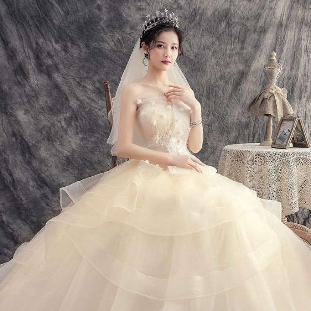- シャンパン系カラードレスに胸元の白い花の飾りも良く映えて、スカートもレイヤーが重なり、胸元もスカートも凝ったデザインで綺麗です。 素材もドレス自体もとても軽いです。着心地も持ち運びも着脱も楽で良いです...