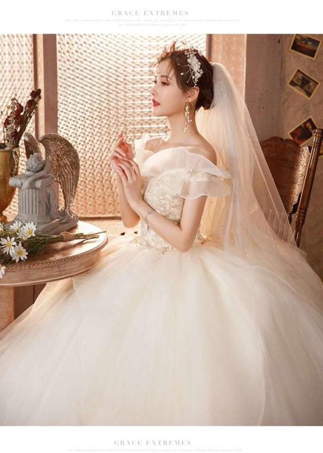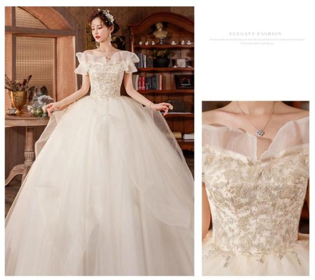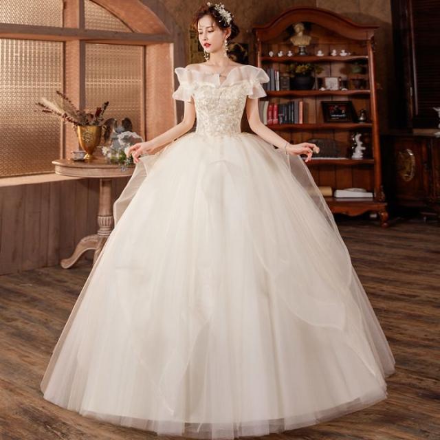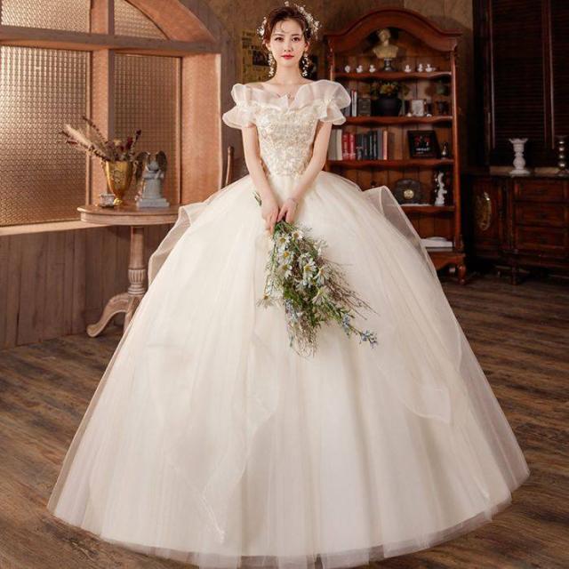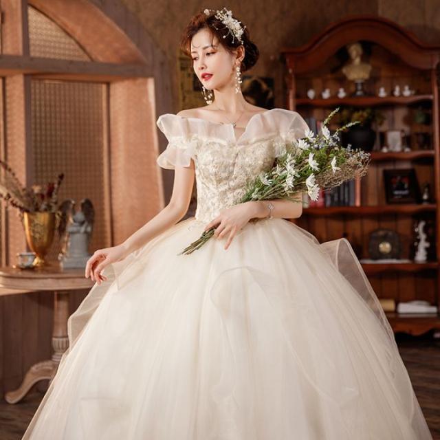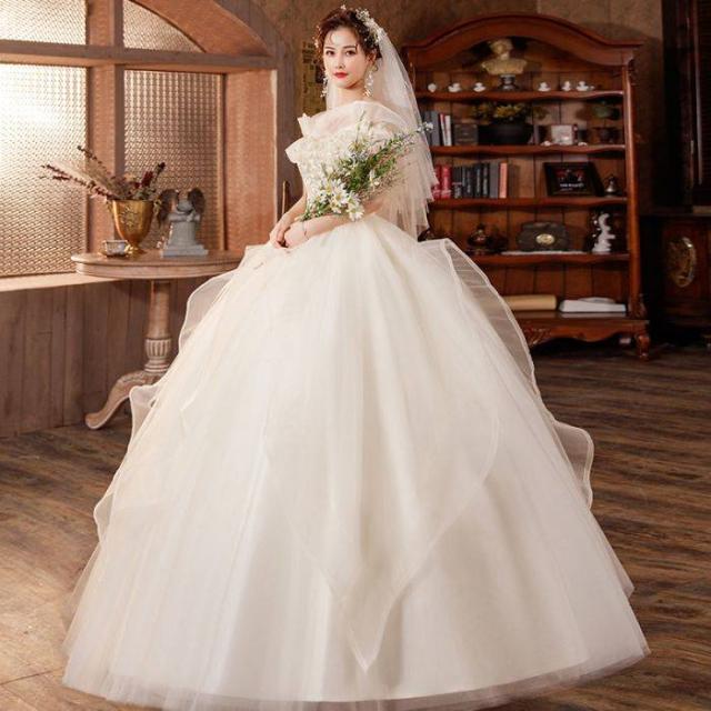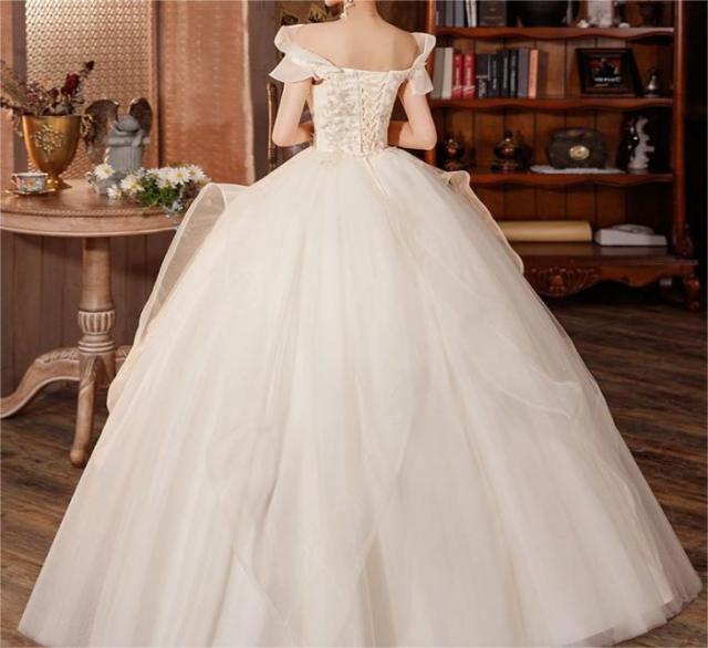 ウェディングドレス プリンセスライン ロングドレス プリンセスドレス ホワイト 森ガール系 お嫁さん 結婚式 編み上げ シンプル オフショルダー 花嫁 キラキラ