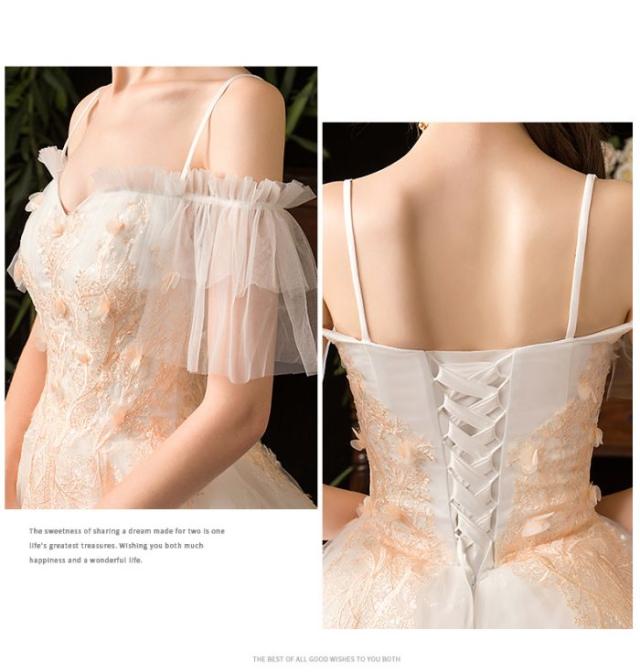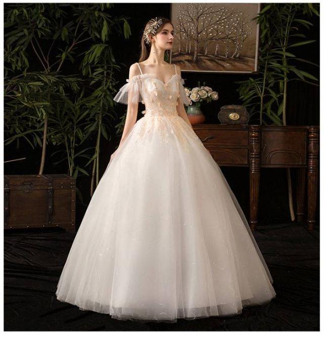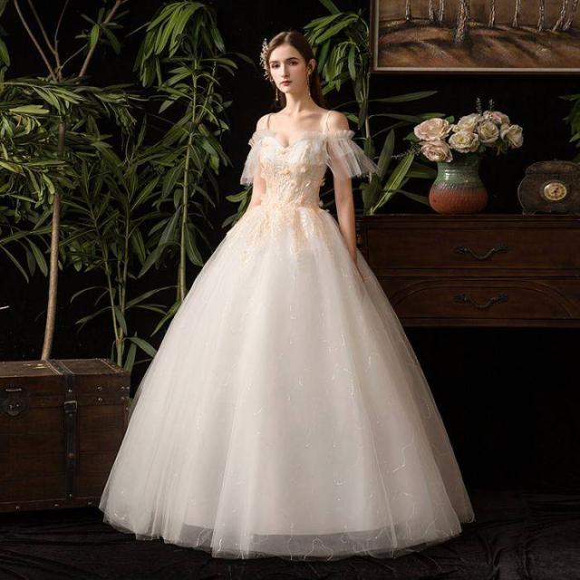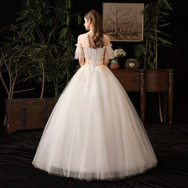 ウェディングドレス プリンセスライン ショルダーネック フリ袖 花嫁 レース 花柄 ロングドレス プリンセスドレス ホワイト ナチュラル系 お嫁さん 結婚式 編み上げ シンプル
