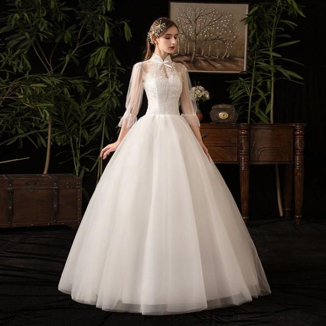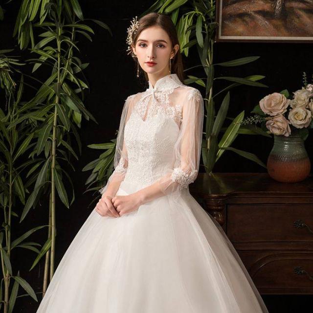 ウェディングドレス プリンセスライン ロングスリーブ 花嫁 レース 花柄 ハイネック ロングドレス プリンセスドレス ホワイト レトロ系 お嫁さん 結婚式 編み上げ シンプル