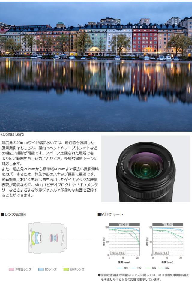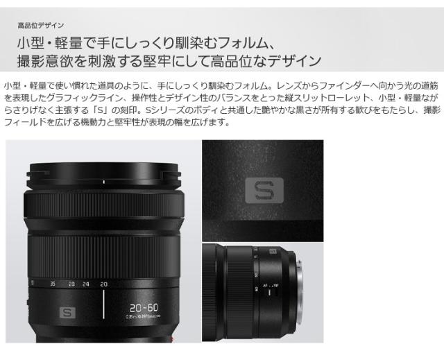| レンズ構成 | LUMIX S 20-60mm F3.5-5.6(S-R2060)(9群11枚(非球面レンズ2枚、EDレンズ3枚、UHRレンズ1枚)) |