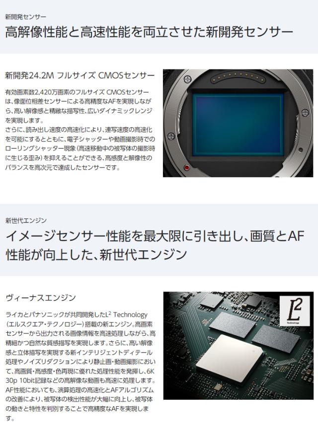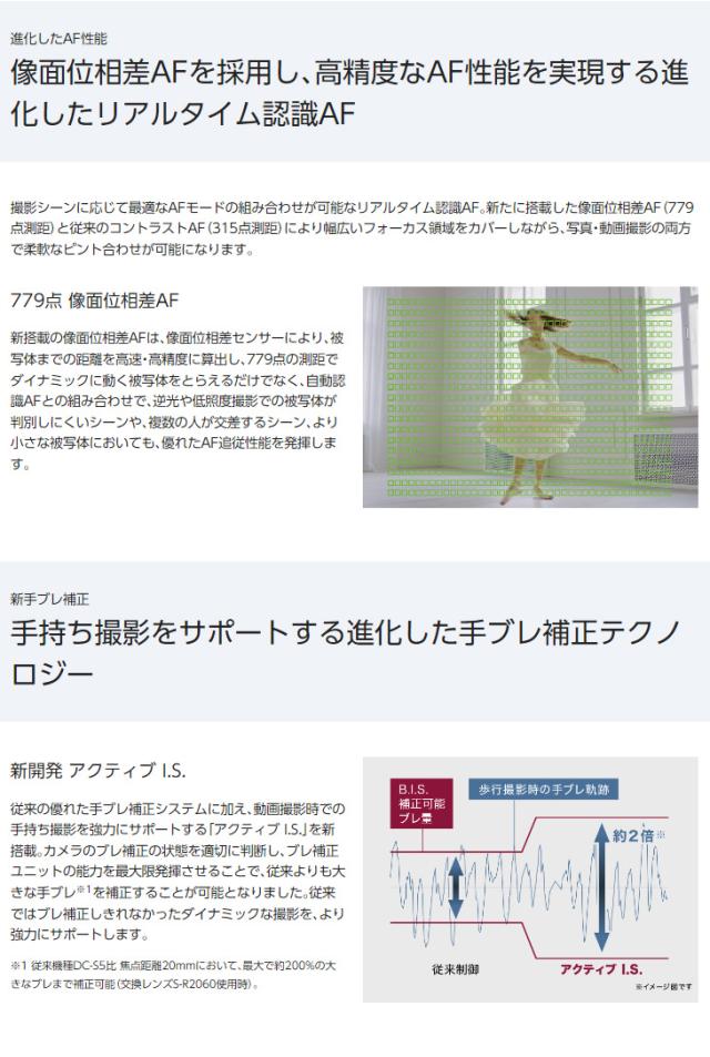 新開発の24.2Mフルサイズセンサーと新世代ヴィーナスエンジンの搭載により、階調表現豊かで自然な描写撮影に加え、LUMIX初の像面位相差AFを搭載し、779点の測距点で被写体までの距離を高速・高精度に算出することで、ダイナミックに動く被写体の追従性能が大幅に向上しました。