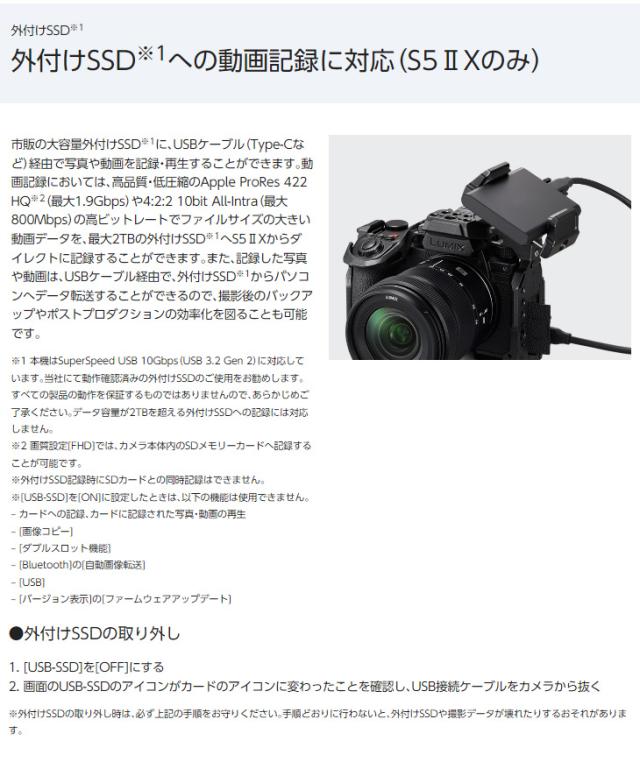 DC-S5M2Xでは、動画RAW出力やApple ProRes 422HQの外部SSD記録にも対応し、プロフェッショナルユーザーに応える高いクオリティの映像制作が可能です。さらに、プロフェッショナルの道具として撮影現場に溶け込む重厚感あるLUMIX初のブラックデザインを採用しました。