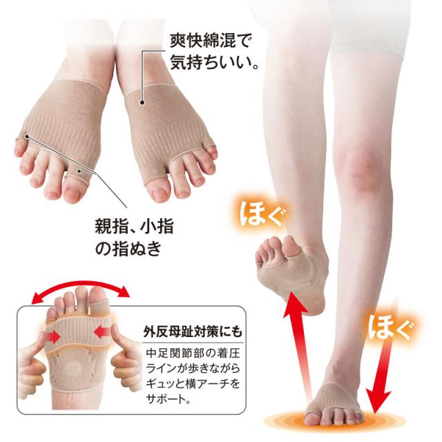 管理医療機器の足裏サポーター。足裏のコリをほぐしながらラクラク歩ける。土踏まずのポイントにクッション編みと磁石を配置。クッション編みの柔らかさで磁石が土踏まずにグッと。また歩行中、磁石に違和感を感じさせません。クッション編み周りはメッシュ編みなので蒸れにくい。指先は中足関節部分に着圧ラインを配置。横アーチを補整するので、らくらく歩行をサポートします。外反母趾対策にも!生地は爽快綿混なので気持ちいい。