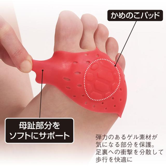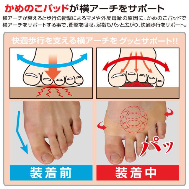 底マメを「かめのこパッド」ががっちりサポート!横アーチが衰えると歩行の衝撃によるマメや外反母趾等、足のお悩みの原因に。かめのこパッドで横アーチをサポートする事で、衝撃を吸収。足指もパッと広がり、快適歩行をサポート。亀の子パッドの周りには空気穴があいているので、蒸れにくい。
