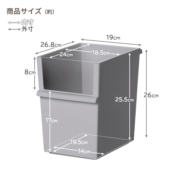 内寸サイズ(約):【底面】幅14×奥行19.5cm 【開口部】幅18.5×奥行24cm 【高さ】取出口まで/17cm 背面/25.5cm